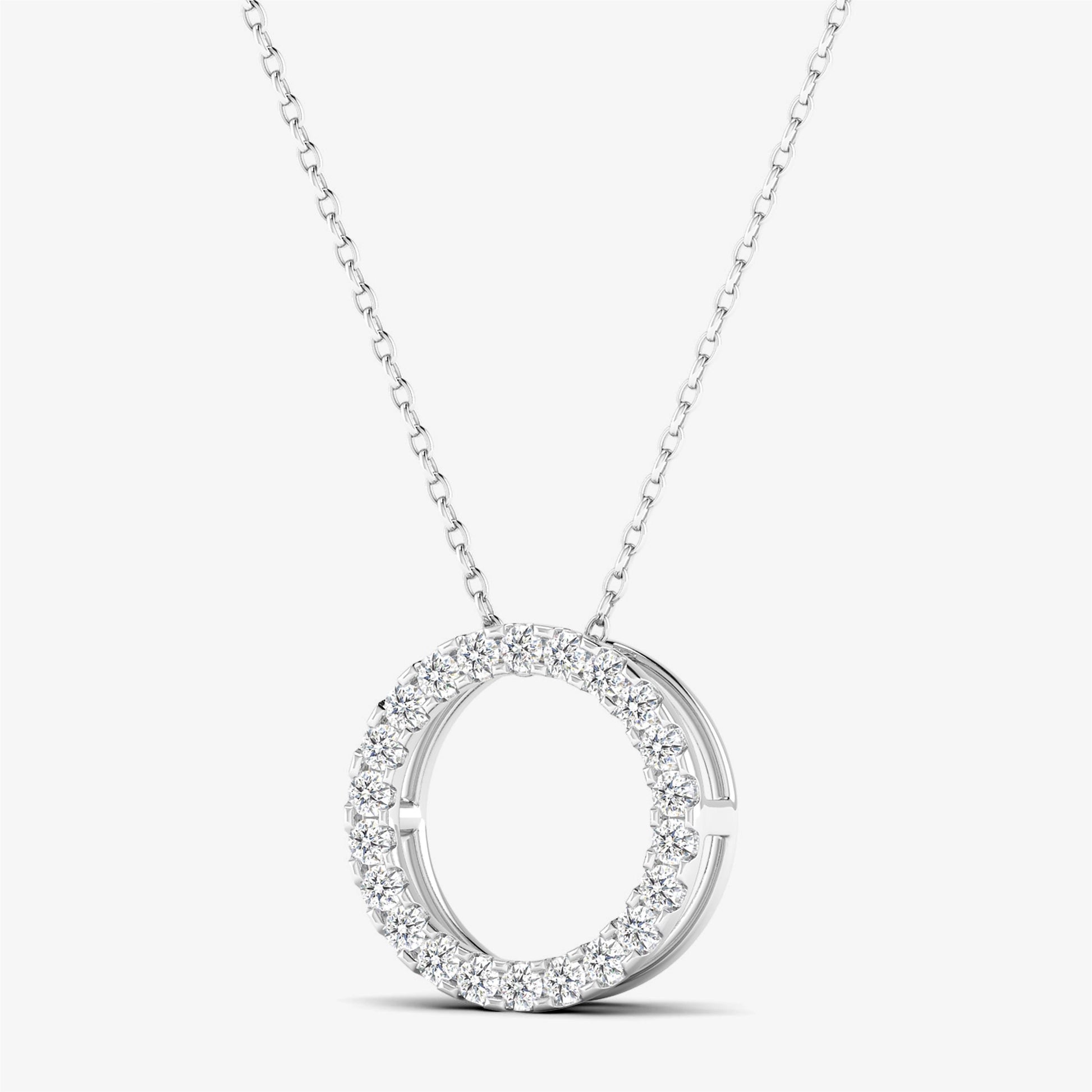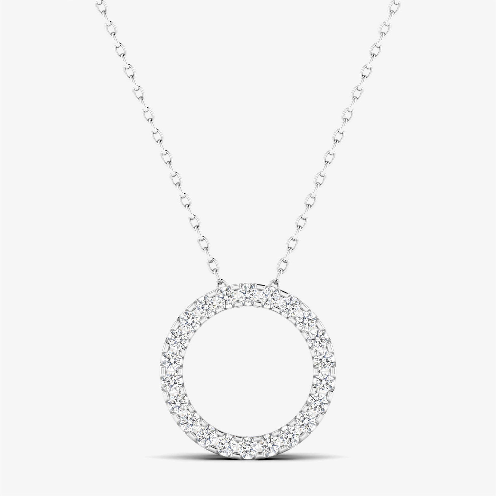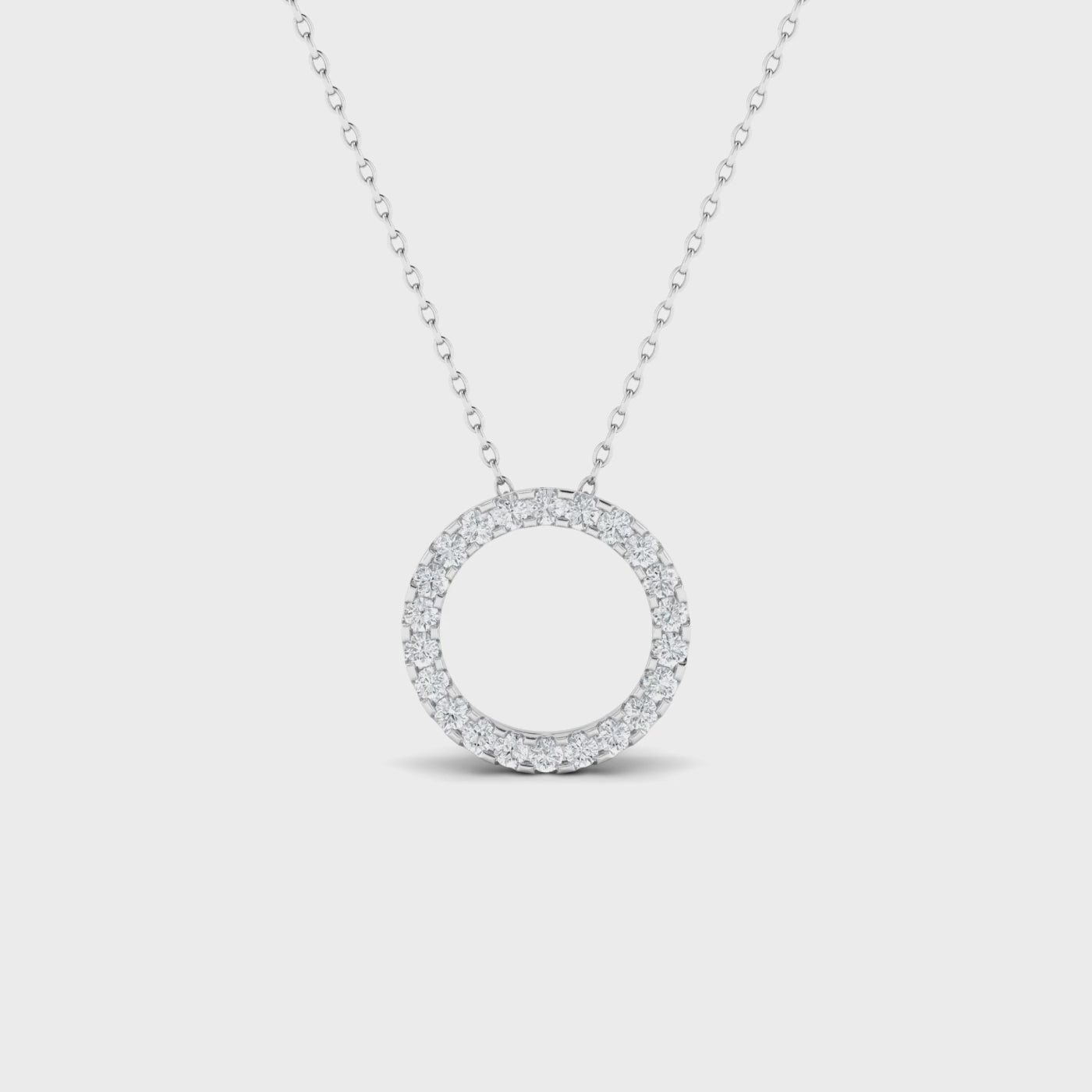 Celebrate the beauty of continuity with our Circle of Life Pendant Necklace. This elegant piece features a circle pendant adorned with natural round-cut white diamonds, all set in 14K solid white gold. The diamonds are securely held in a classic prong setting, enhancing their brilliance. Suspended from a 14KT cable chain, this 18" necklace is a timeless symbol of eternal love and unity, making it a meaningful addition to any jewelry collection.