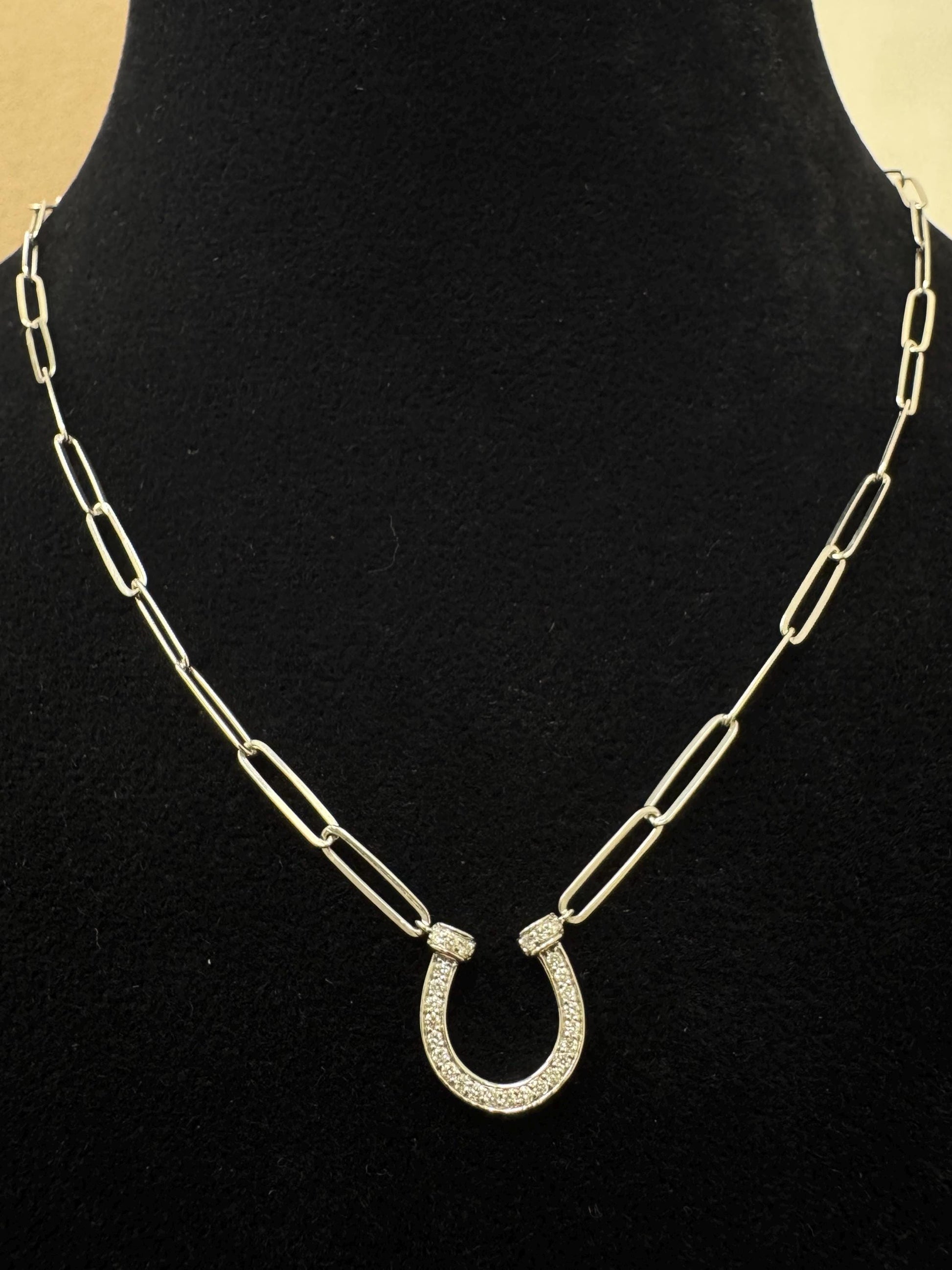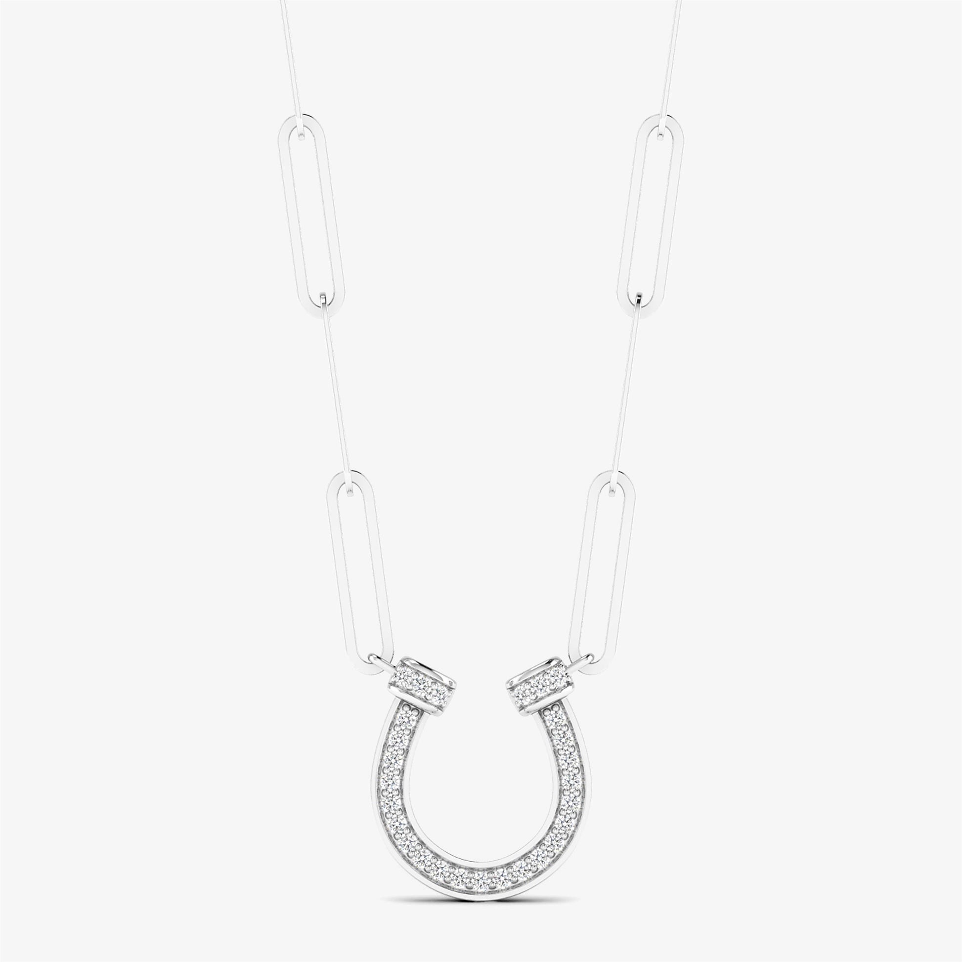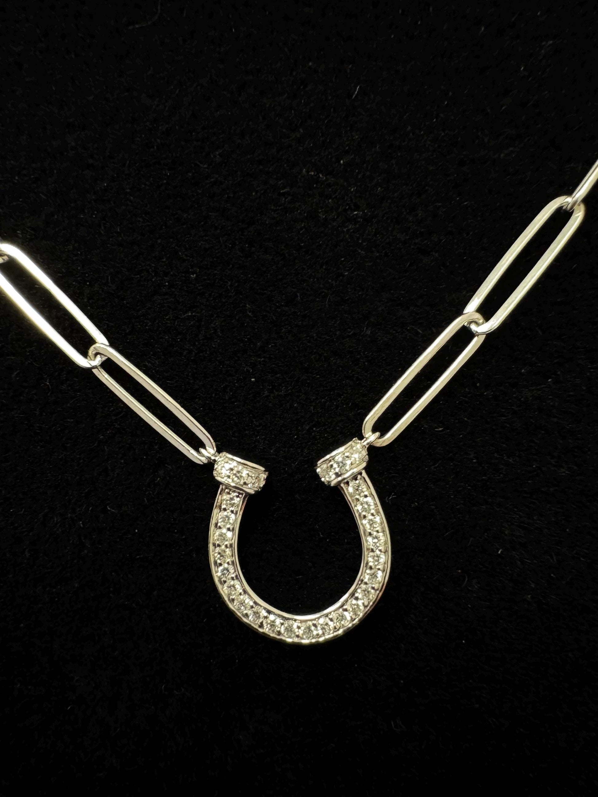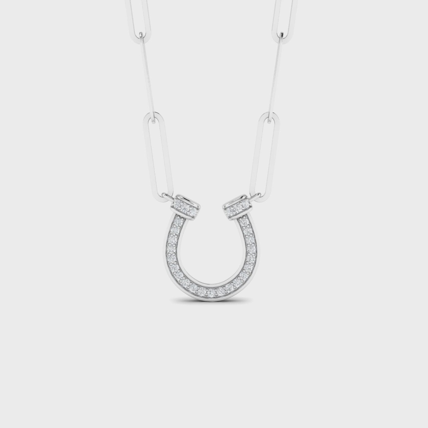 Bring luck and elegance together with our 14K Solid White Gold Horseshoe Pendant Necklace. This exquisite piece features a charming horseshoe design adorned with natural I-quality diamonds, beautifully paired with a modern paperclip chain. Crafted from 14K solid white gold, this pendant necklace blends timeless sophistication with a contemporary edge, making it the perfect accessory for any occasion.