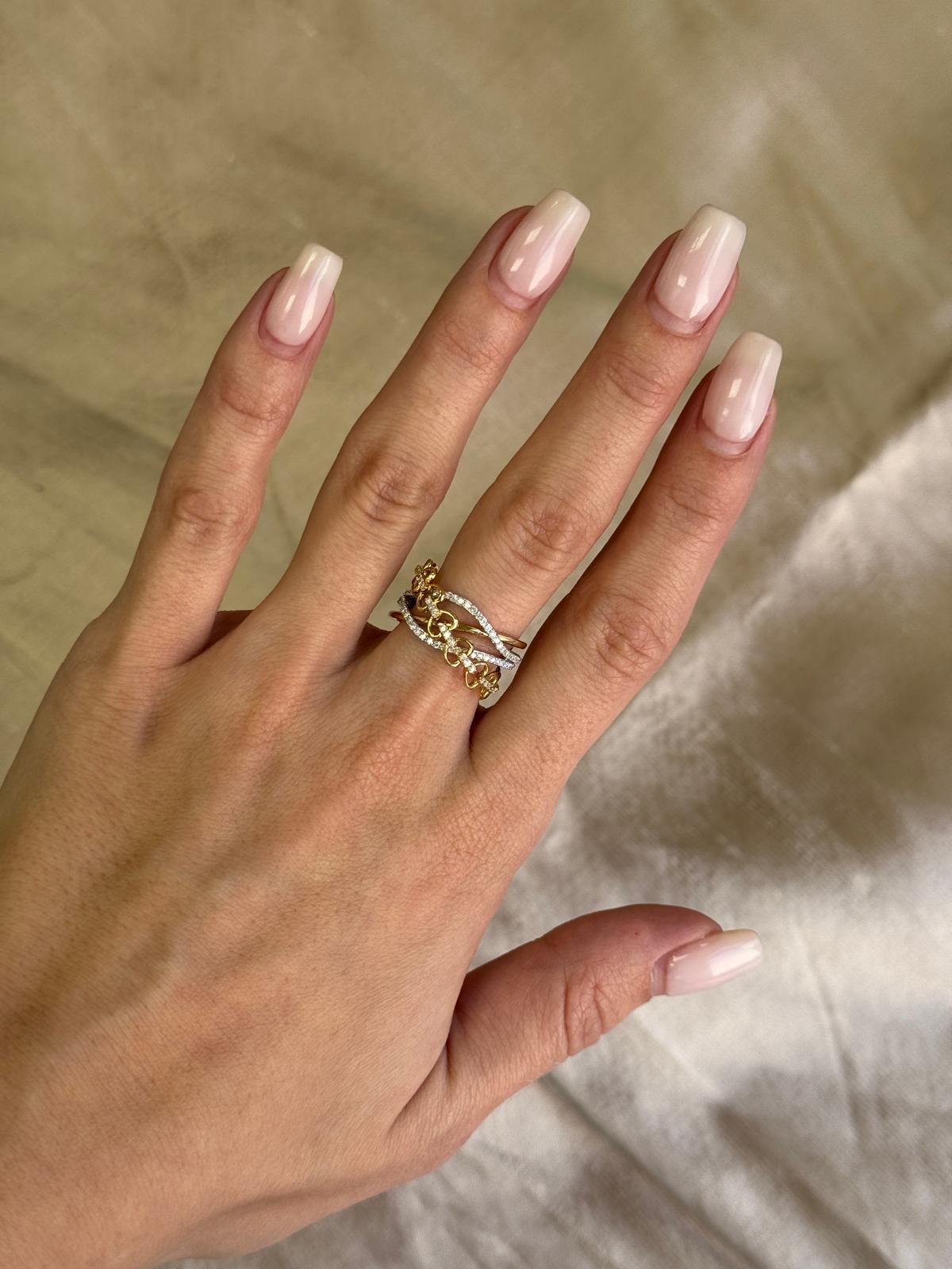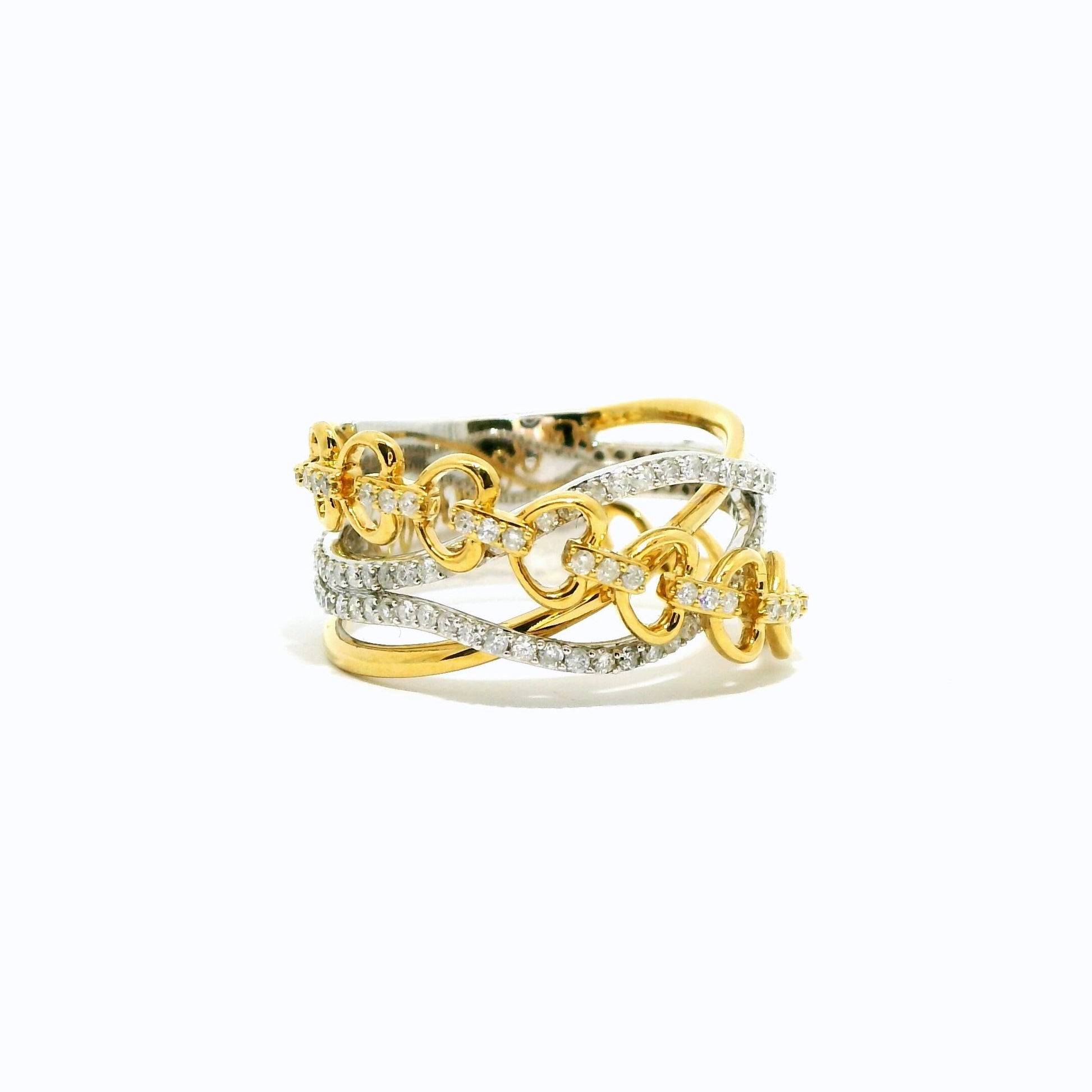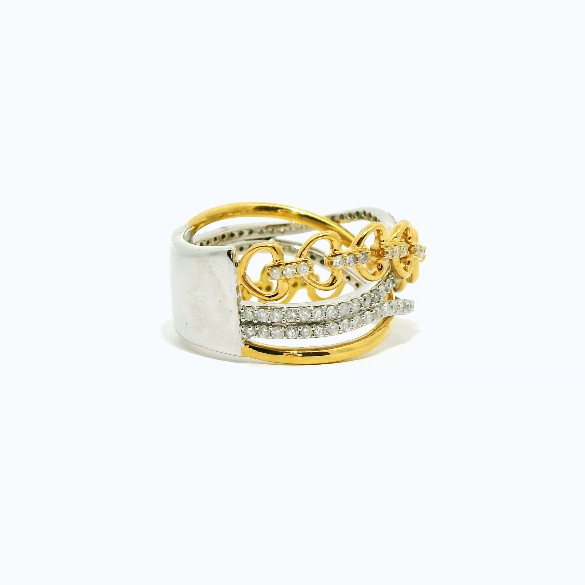 Make a statement with our 14KT Two Tone Diamond Fashion Ring. This exquisite ring features a unique heart chain crossover design, crafted from 14K solid gold and adorned with natural real diamonds. A perfect ladies' fashion ring, blending elegance and contemporary style.
