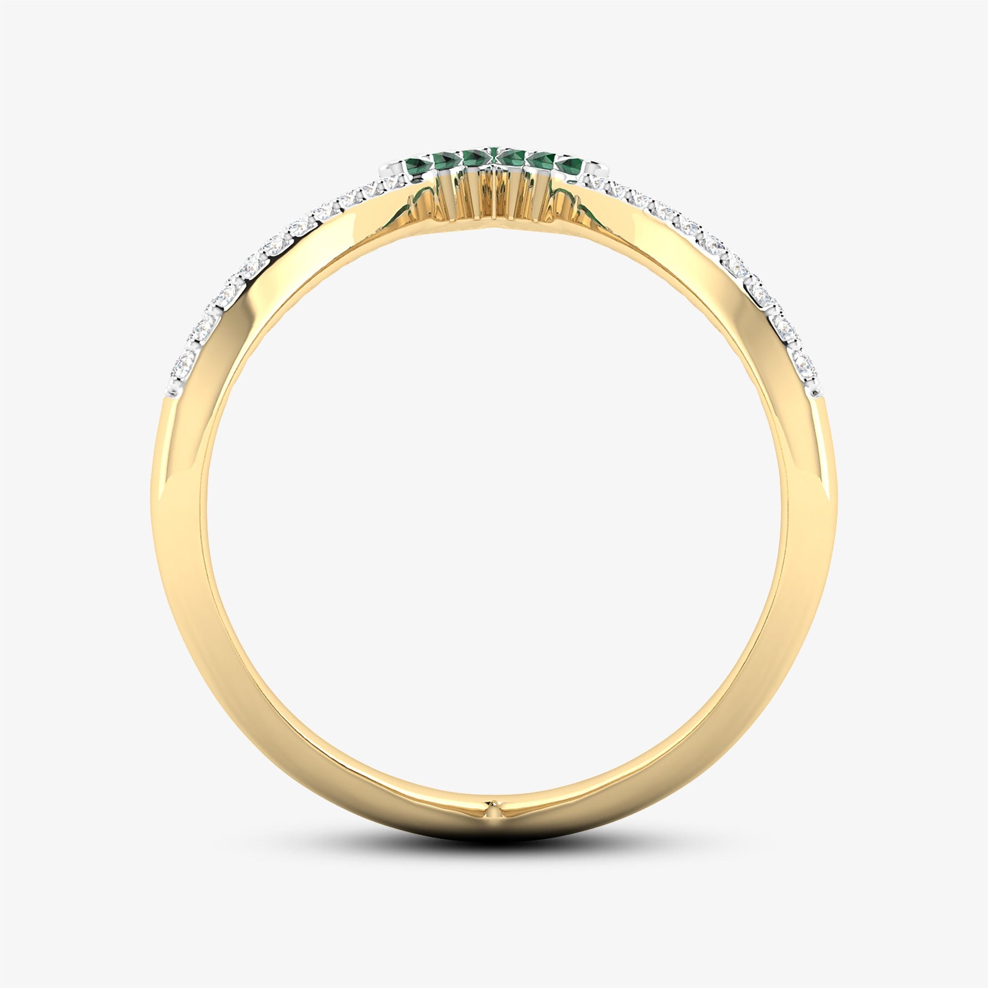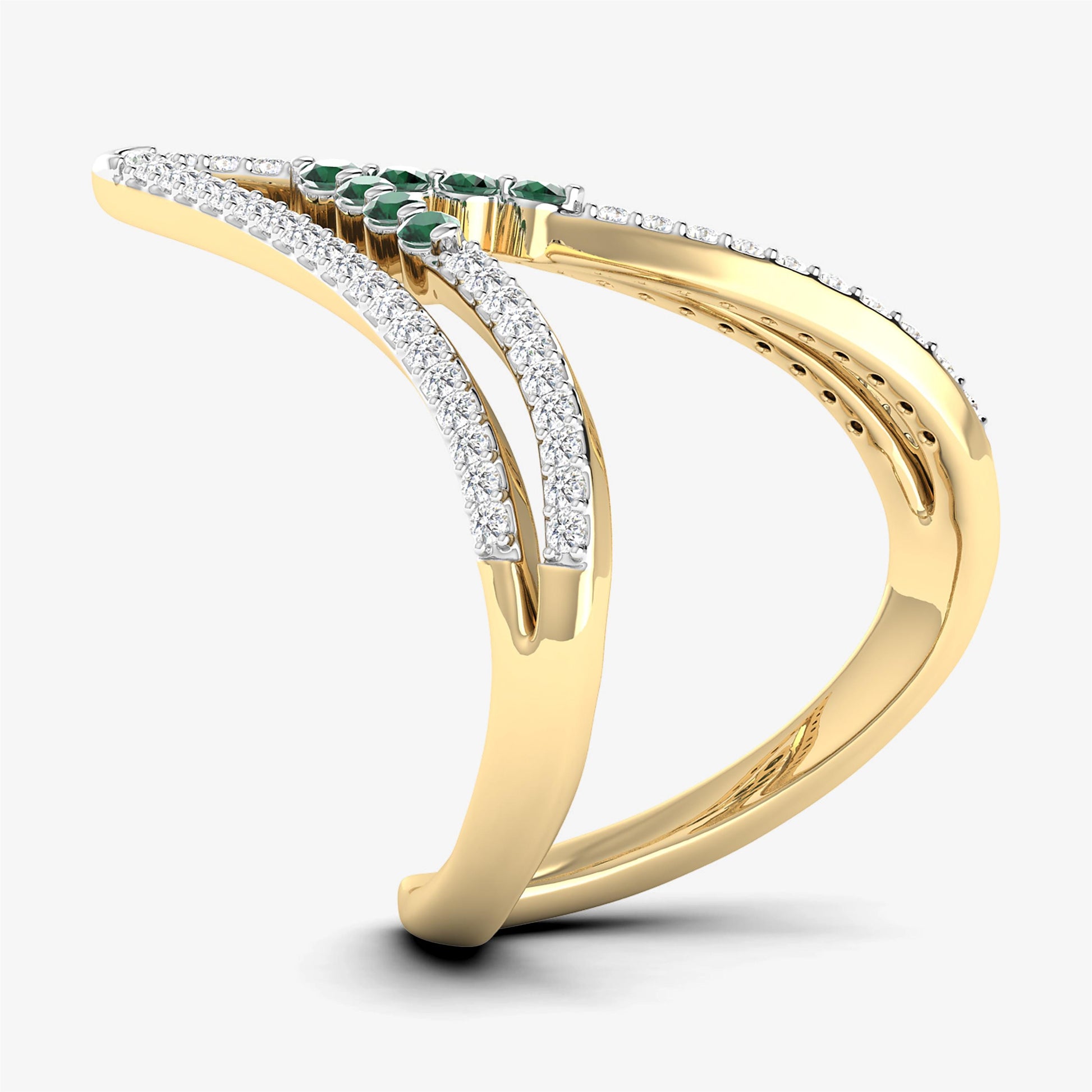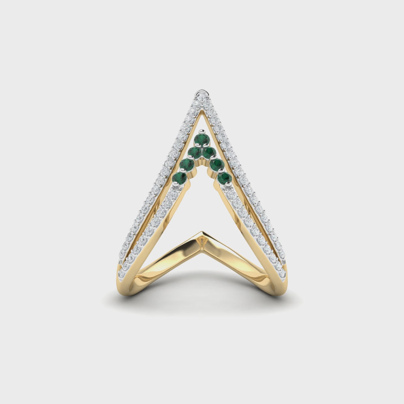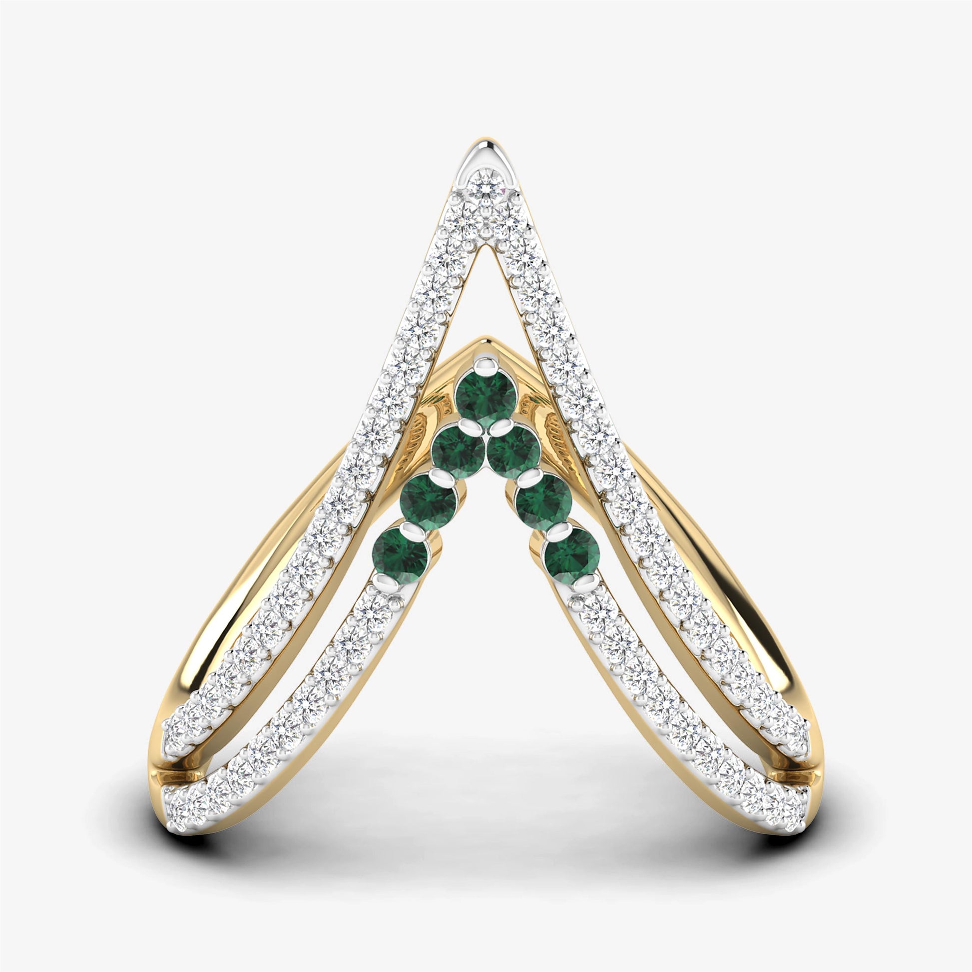Embrace the beauty of elegance with our 18K Yellow Gold Diamond Ring. This stunning piece features a double V design adorned with diamonds and precious emeralds, making it a timeless choice for a Wedding Ring or an Emerald V Shape Chevron Ring. Crafted from 18K yellow gold, this ring captures the essence of sophistication and style with its natural diamond and emerald accents.