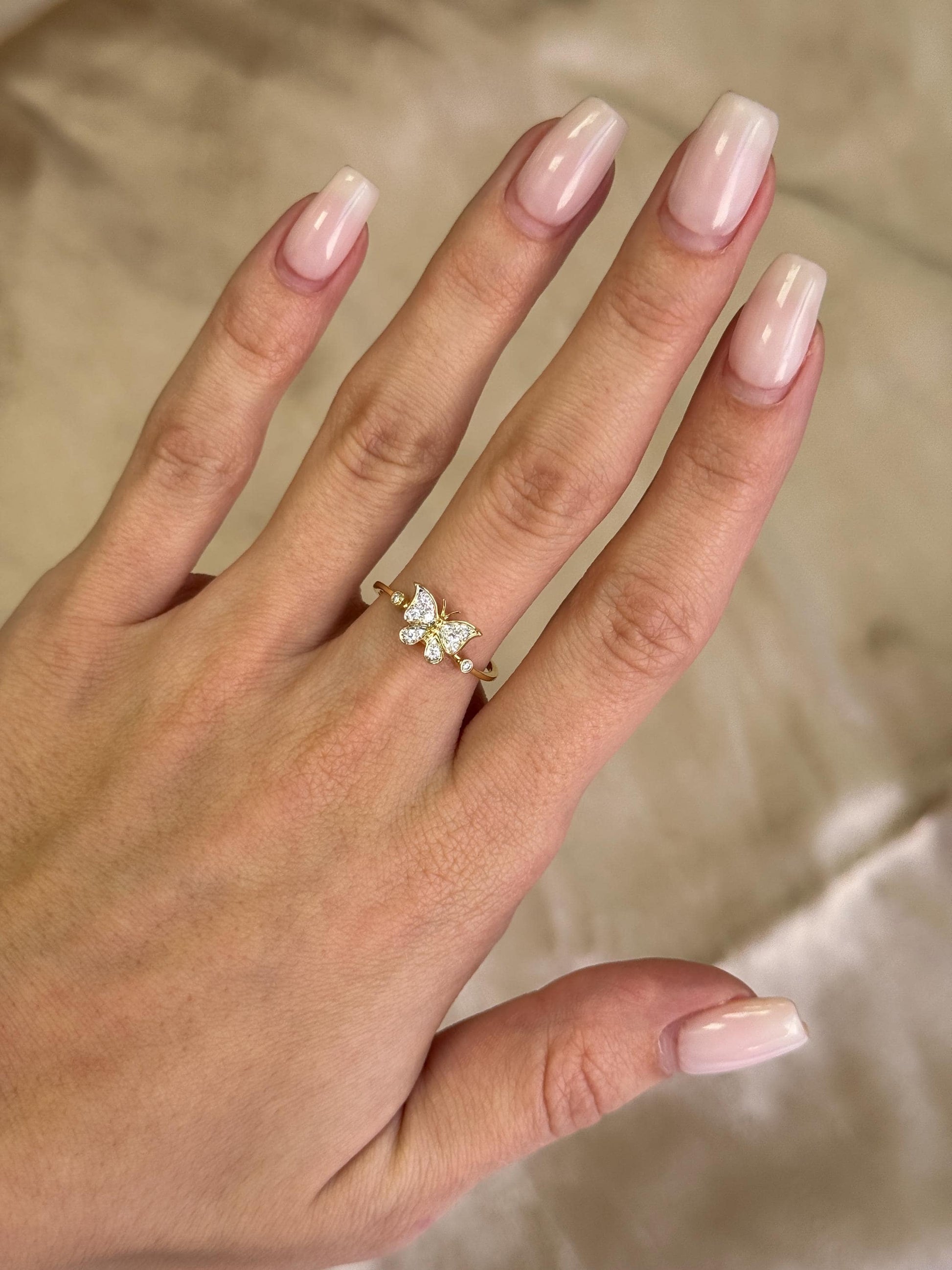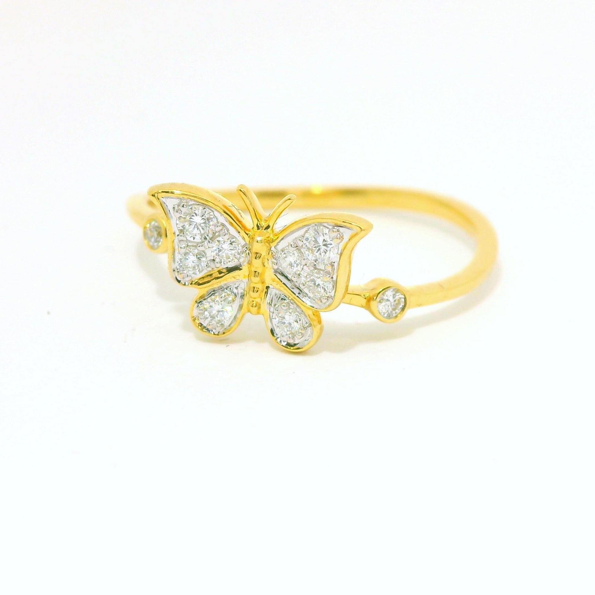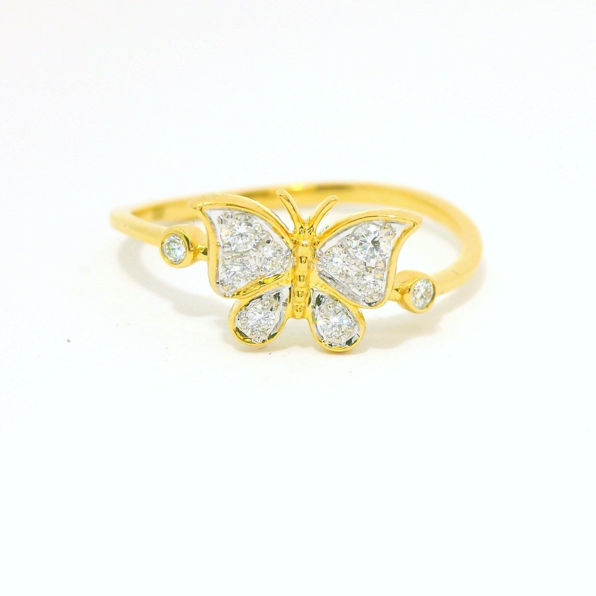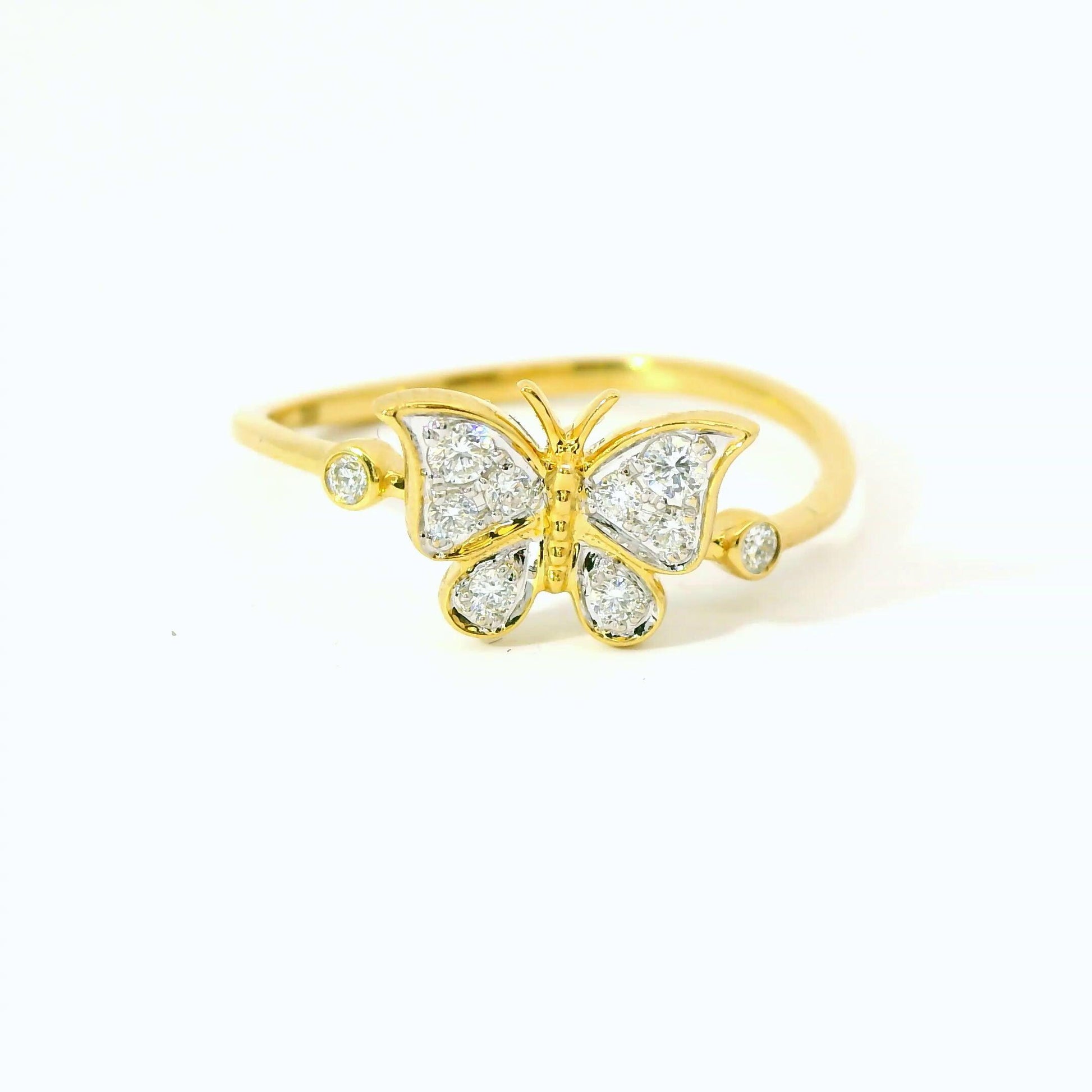 Embrace the beauty of elegance with our 18K Yellow Gold Diamond Ring. This exquisite ring features natural diamonds set in a solid gold butterfly design, making it a timeless choice for a Handcrafted 18KT Diamond Ring or a Women Fashion Ring. Designed with sophisticated charm, this ring captures the essence of style and craftsmanship with its graceful allure.