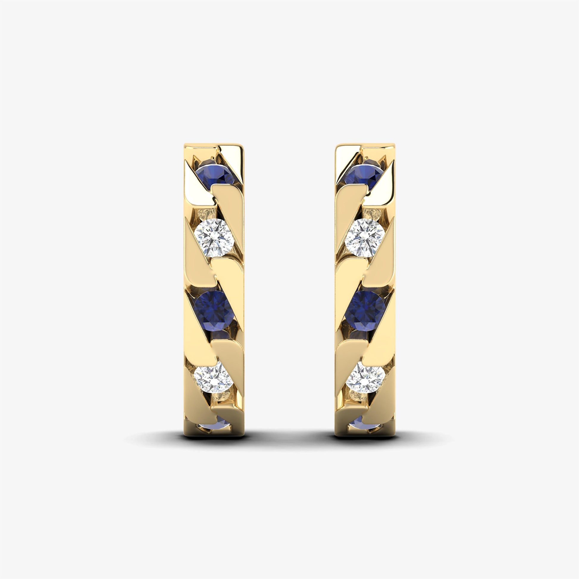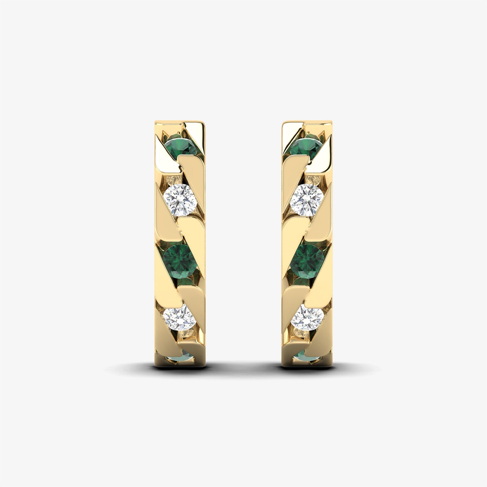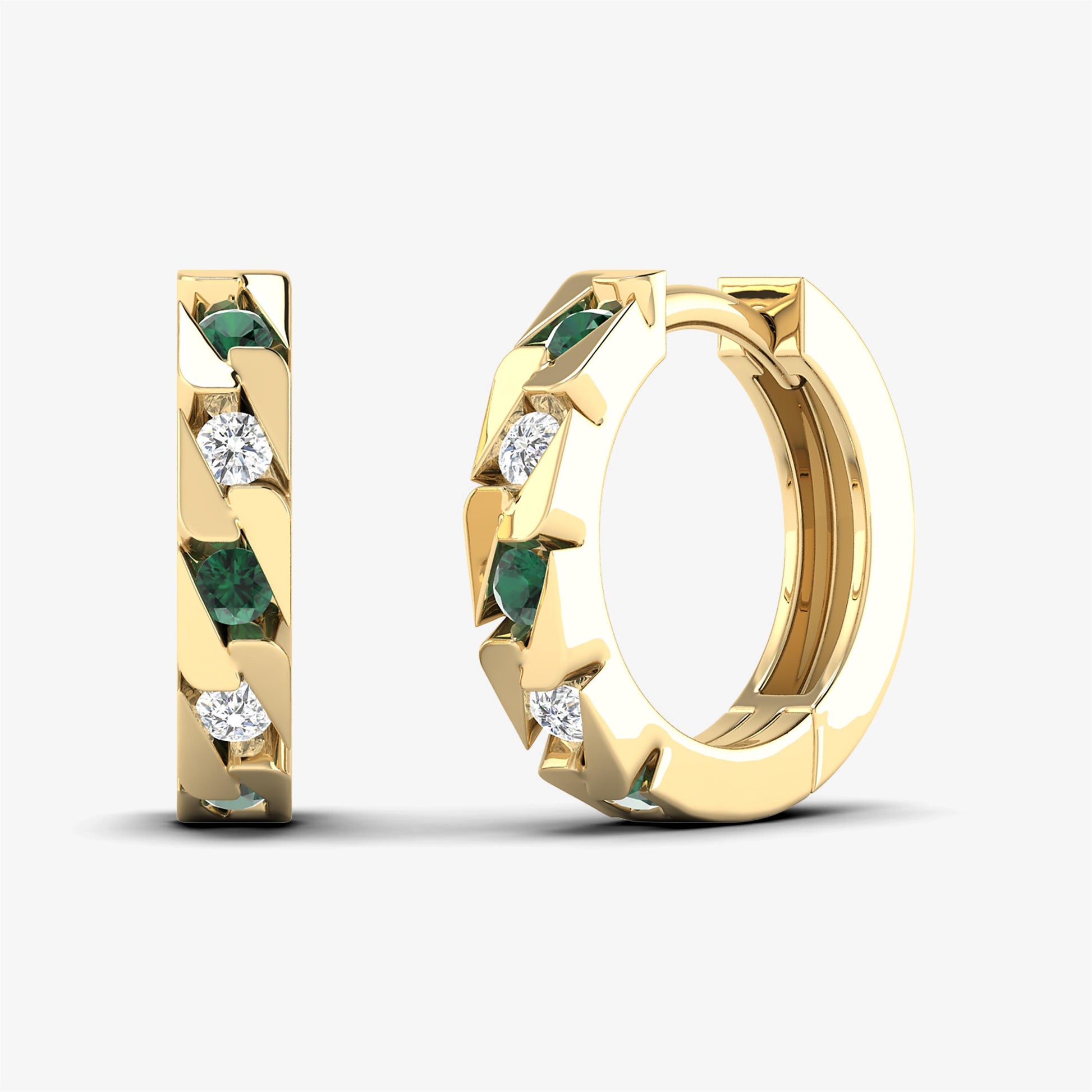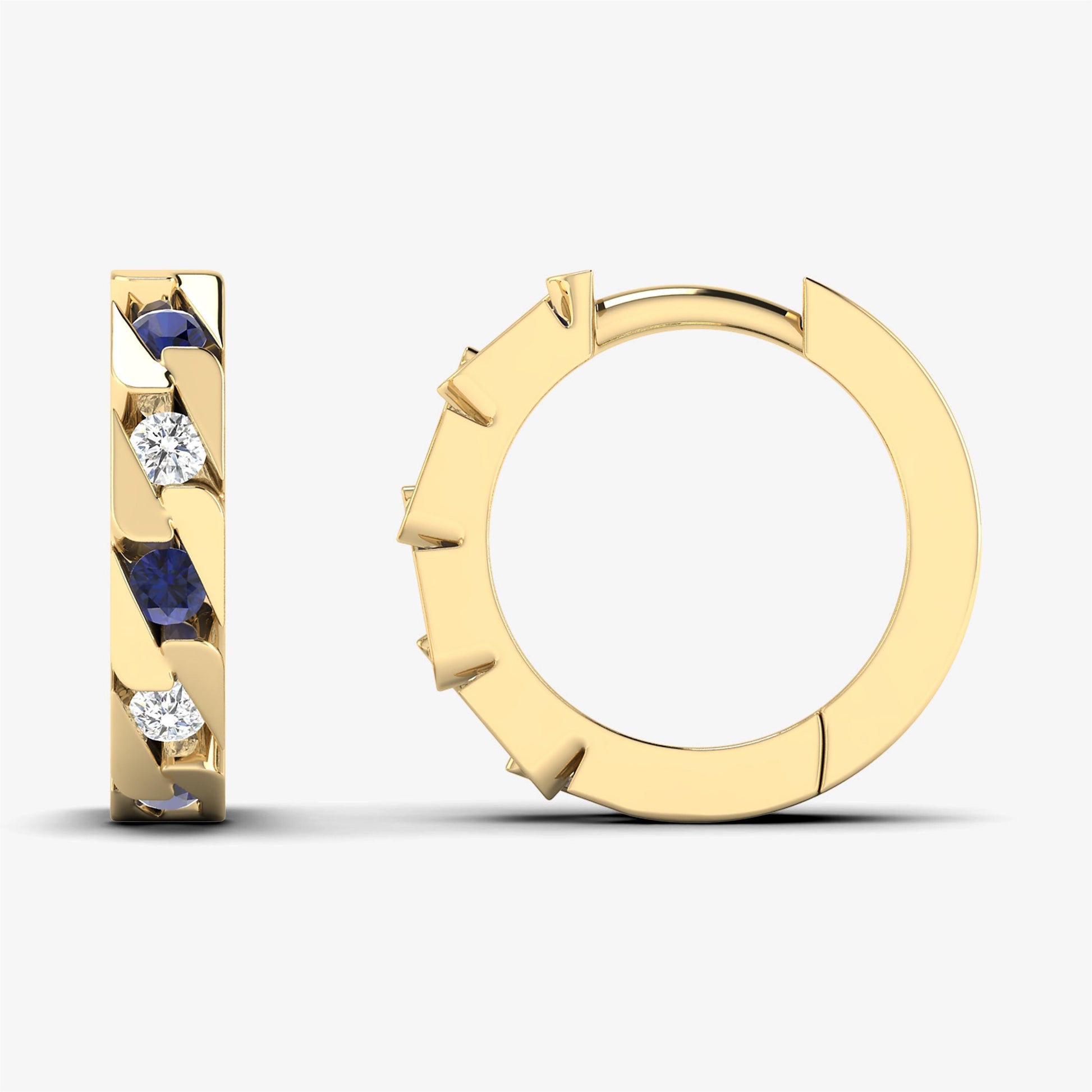 Enhance your elegance with our Alternating Huggie Earrings, crafted from solid yellow gold. These exquisite hoops feature natural round-cut diamonds alternating with precious gemstones, all set in a refined channel setting. Available in 18K with Emerald Diamond or 14K with Sapphire Diamond solid gold, these diamond hoops combine classic luxury with a unique twist, making them a standout addition to any jewelry collection. Perfect for those who appreciate a blend of sophistication and vibrant color.