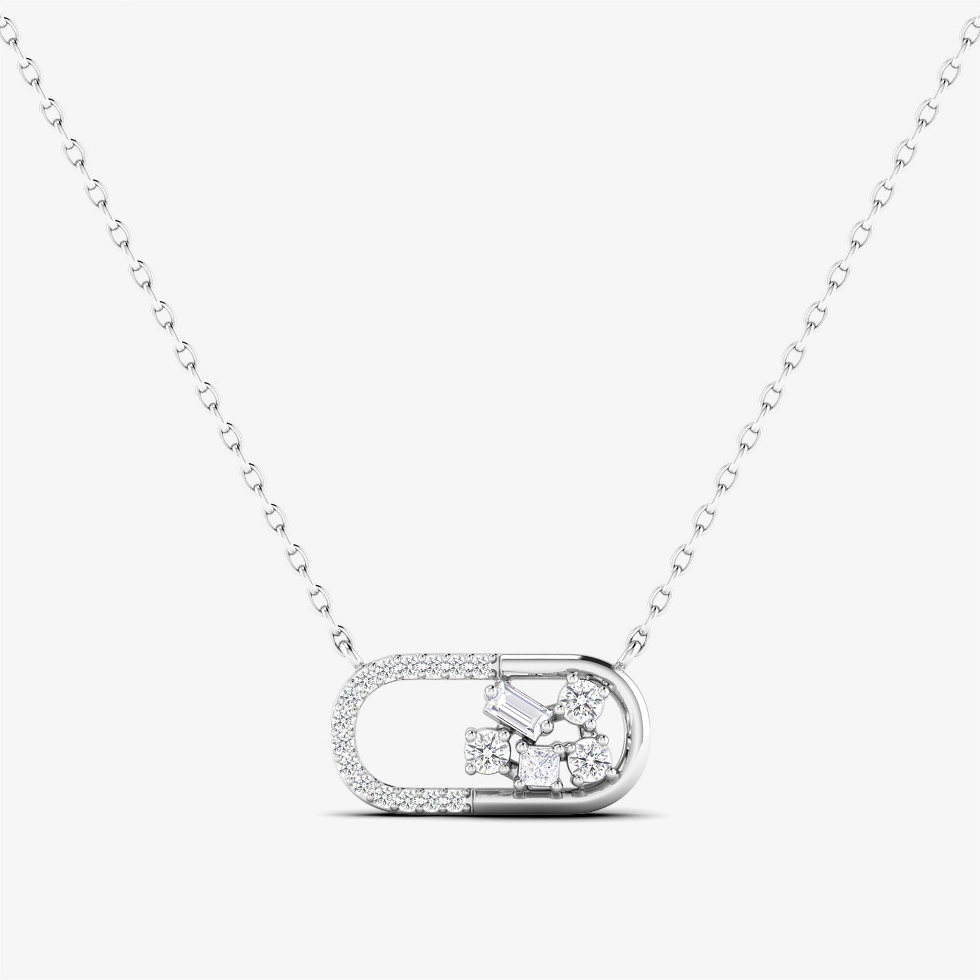 Explore our exquisite 18K Solid White Gold Paperclip Necklace. This unique piece features natural round diamonds and a single baguette diamond set in a prong setting. The distinctive paperclip pendant, crafted from 18K solid white gold, adds a contemporary touch to this exquisite necklace, making it perfect for any occasion.