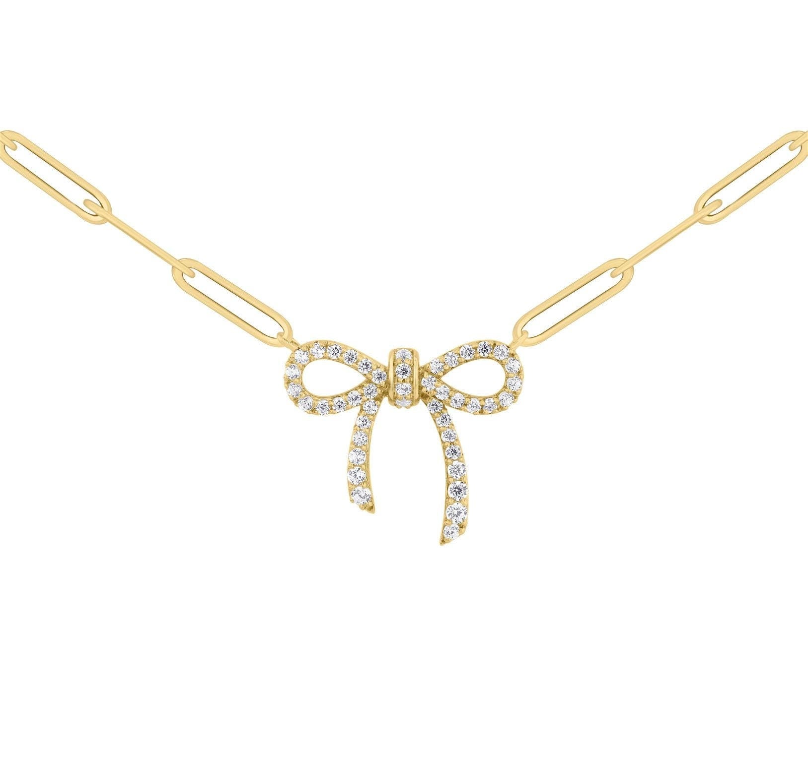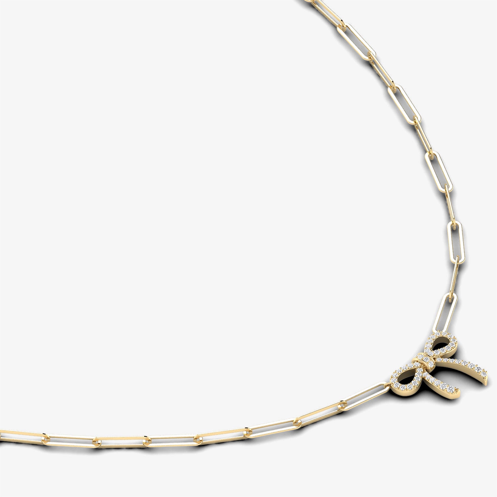 Embrace the beauty of graceful elegance with our 14K Diamond Bow Necklace. This charming piece features natural diamonds set in a solid 14KT yellow gold bow design. The dainty ribbon necklace is adorned with a paperclip link chain with diamonds carefully set on prong setting. Perfect as a gift for women, this necklace captures the essence of timeless sophistication and delicate charm.
