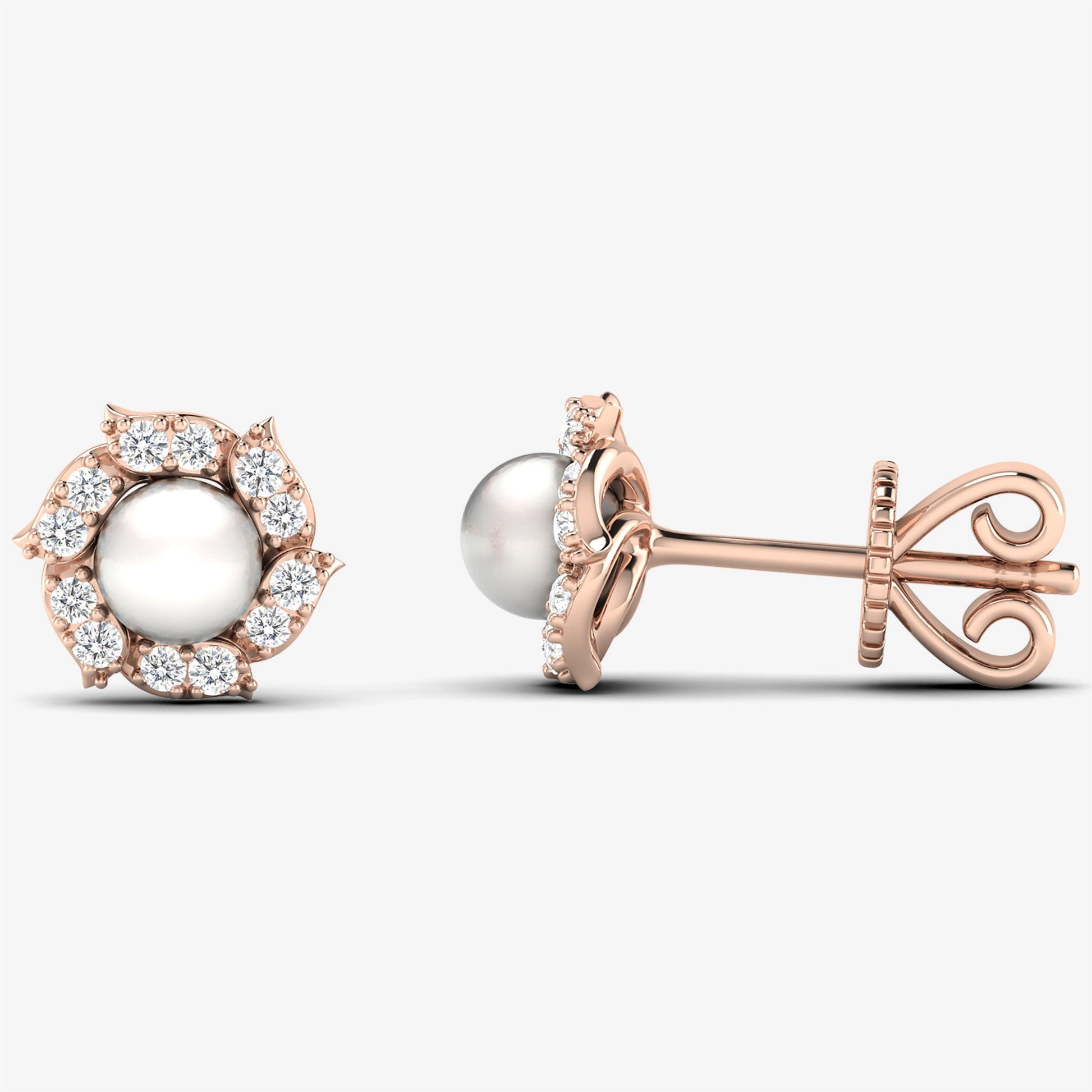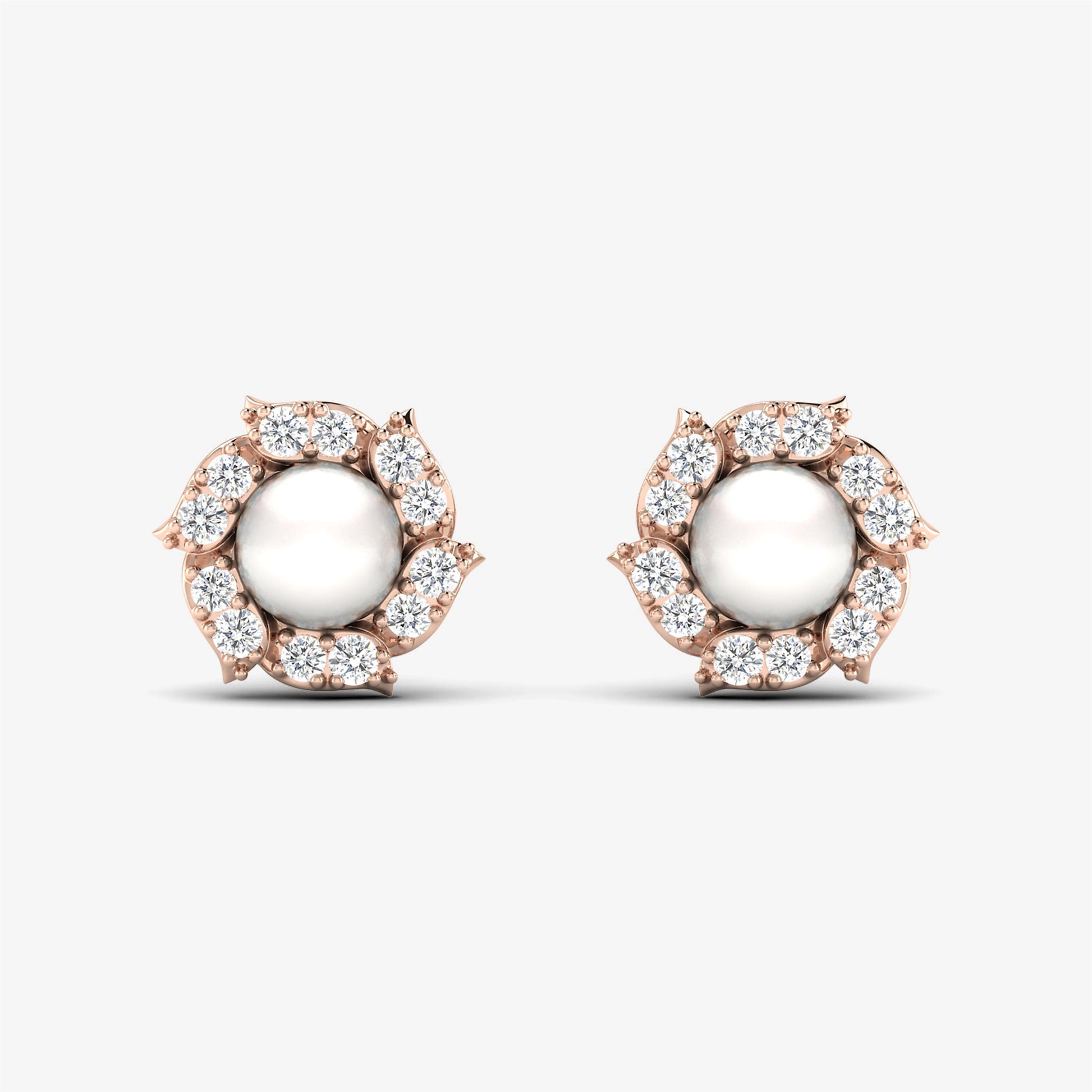Elevate your elegance with our Round Cut White Diamond Pearl Earrings, crafted from 18K solid pink gold. These exquisite stud earrings feature a lustrous pearl surrounded by natural round-cut white diamonds, forming a delicate flower design. The combination of the pearl and sparkling diamonds creates a timeless and sophisticated look. Perfect for any occasion, these pearl solitaire earrings are a luxurious addition to your fine jewelry collection.