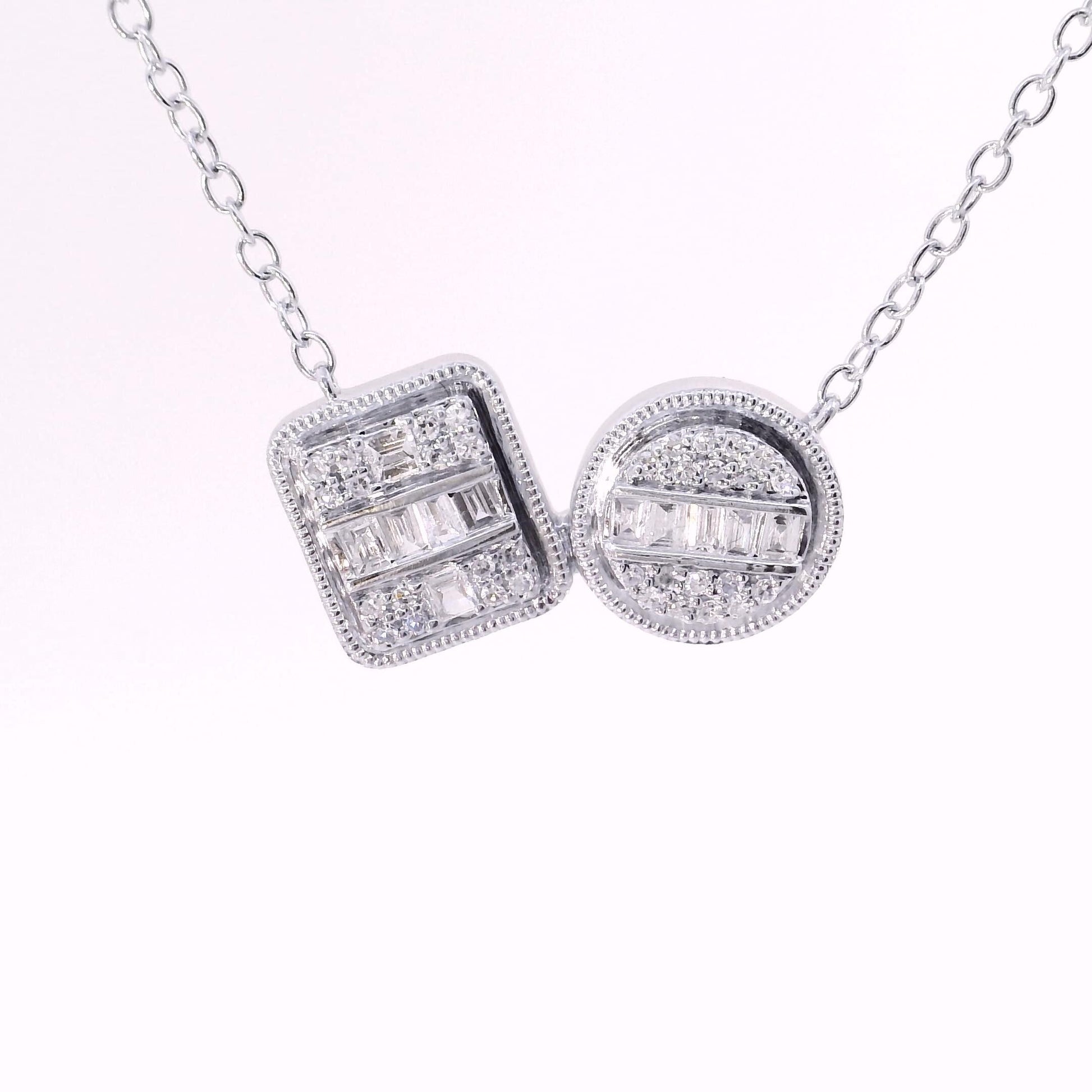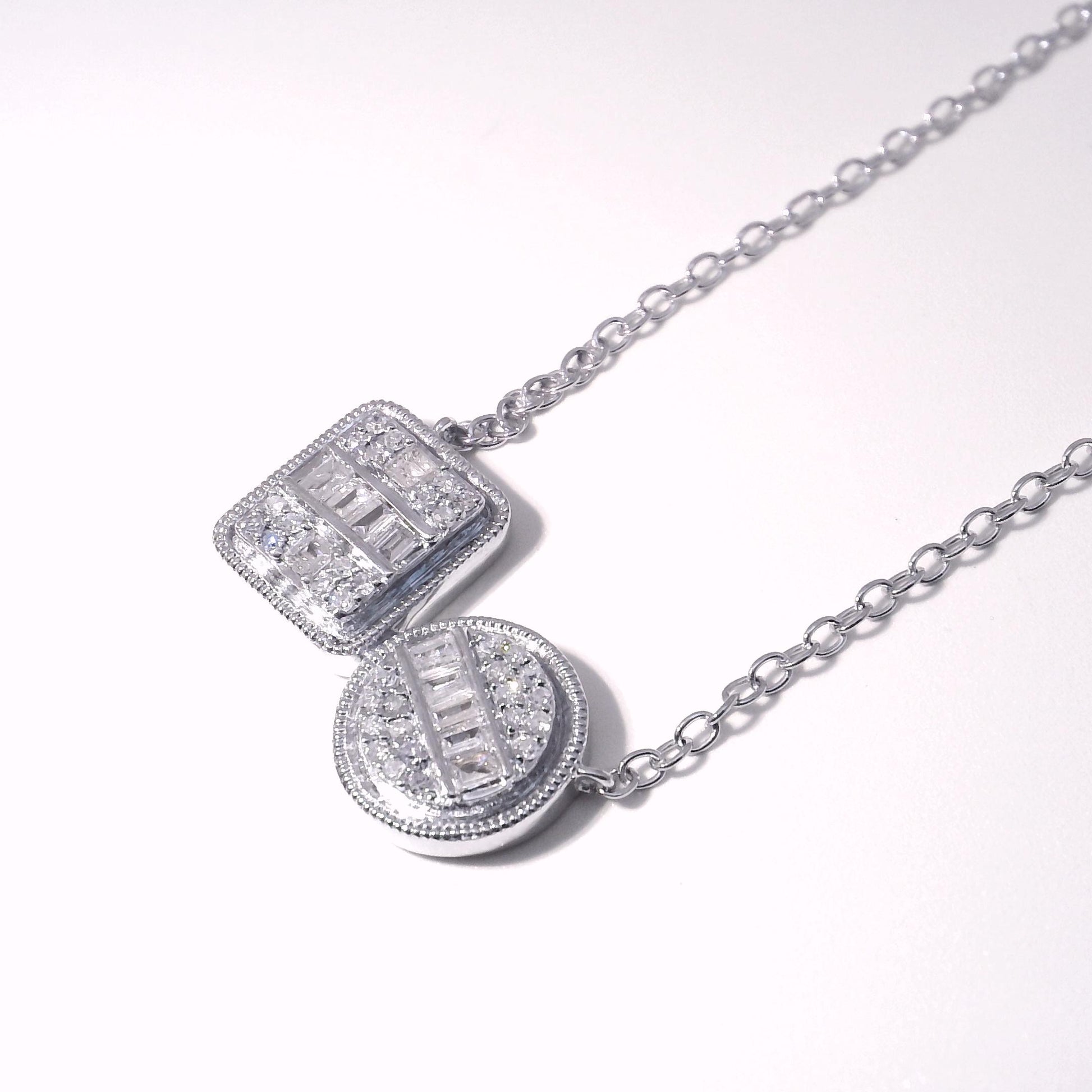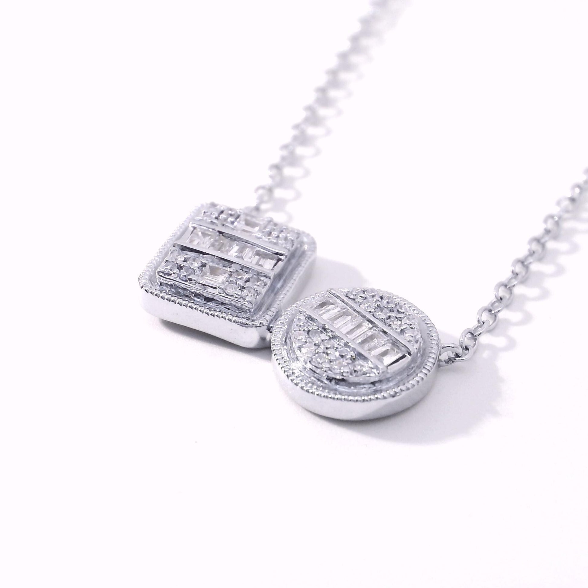 Introducing our Square Circle Flirting Necklace, a stunning blend of geometric elegance and romantic charm. Crafted from 925 sterling silver, this necklace features natural real diamonds that add a touch of brilliance to your look. The baguette centre line enhances its unique design, creating a captivating focal point. With a white silver finish, this diamond necklace is perfect for both everyday wear and special occasions. Make a statement and express your style with this exquisite piece that beautifully balances sophistication and playfulness.